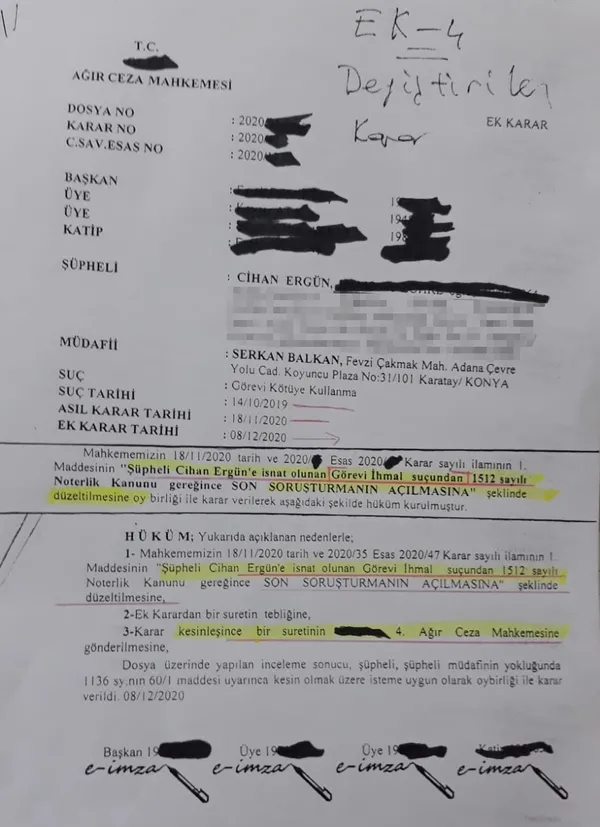 Olaya konu kişinin noter olmasına karşın bir avukat kimliği üzerinden soruşturma açıldığının fark edilmesi üzerine, söz konusu yanlış kararın ek karar ile düzeltilmesi talep edildi. Talebin incelenmesi sonrası, Avukatlık Kanunu gereği soruşturma açılmasına dair kararın yanlışlıkla verildiği, bunun, “Şüpheli Cihan Ergün’e isnat olunan görevi ihmal suçundan 1512 sayılı Noterlik Kanunu gereğince son soruşturmanın açılmasına” şeklinde düzeltilmesine oy birliği ile karar verildiği belirtildi.