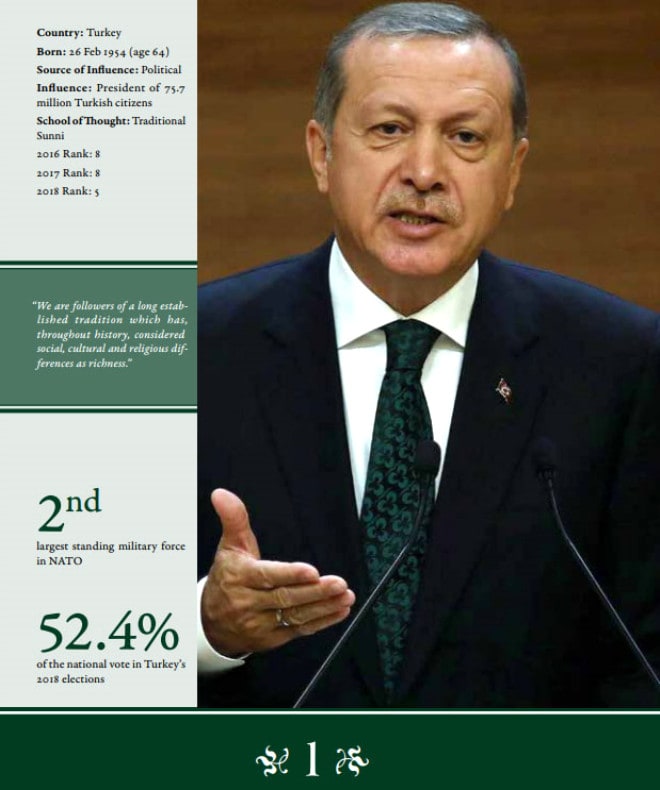 Türkiye Başkanı Recep Tayyip Erdoğan, Dünyanın En Etkili 500 Müslümanının 2019 baskısında birinci sırada yer aldı. Ürdün merkezli Kraliyet İslami Stratejik Araştırmalar Merkezi tarafından her yıl hazırlanan kitap, Erdoğan’ın Ağustos 2014’te Türkiye’nin ilk halk tarafından seçilen cumhurbaşkanı olduğunu ve daha sonra ikinci dönem seçimin yüzde 86 olduğunun, oyların yüzde 52,5’ini aldığının altını çizdi.